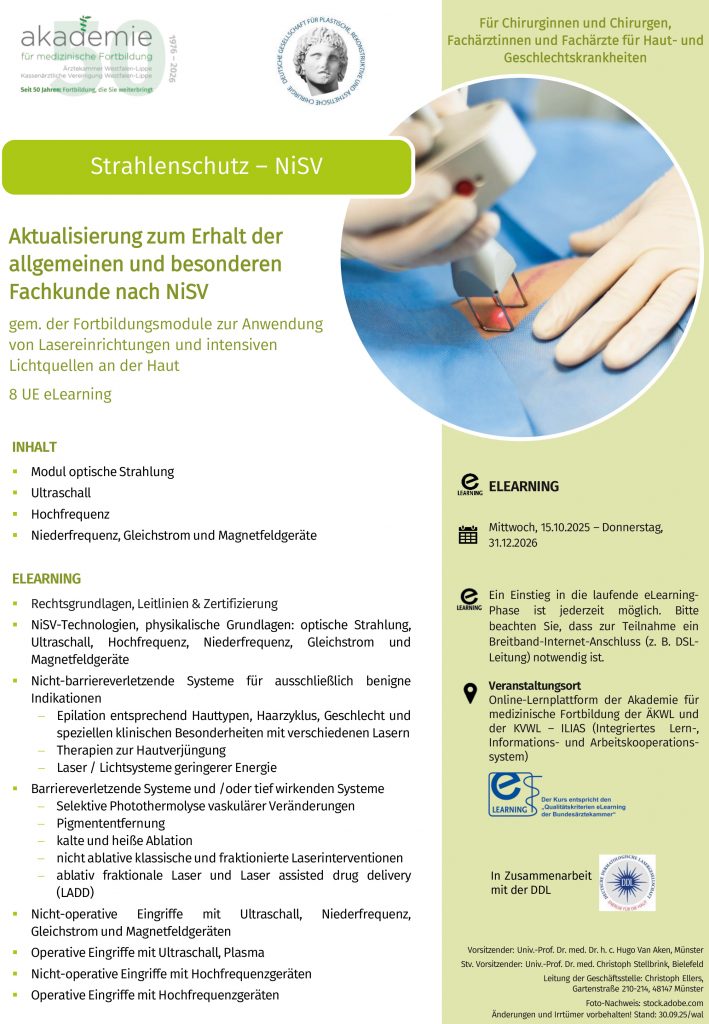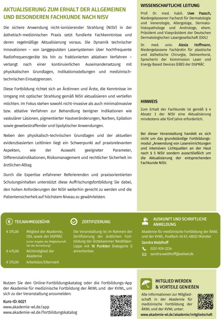 In Zusammenarbeit mit der Akademie der Ärztekammer Westfalen-Lippe bietet die DGPRÄC ganzjährig die alle fünf Jahre erforderliche Auffrischung der Fachkunde zur Anwendung von Lasereinrichtungen und intensiven Lichtquellen an der Haut bei ästhetischen Anwendungen an.